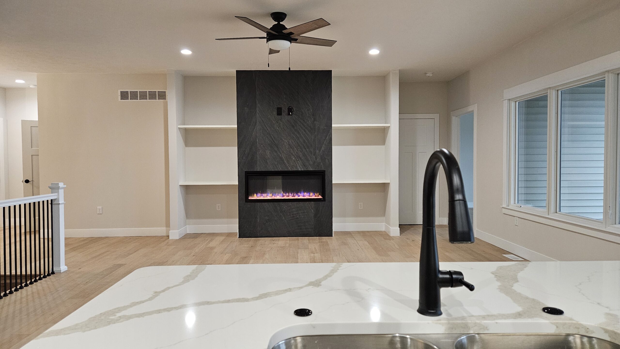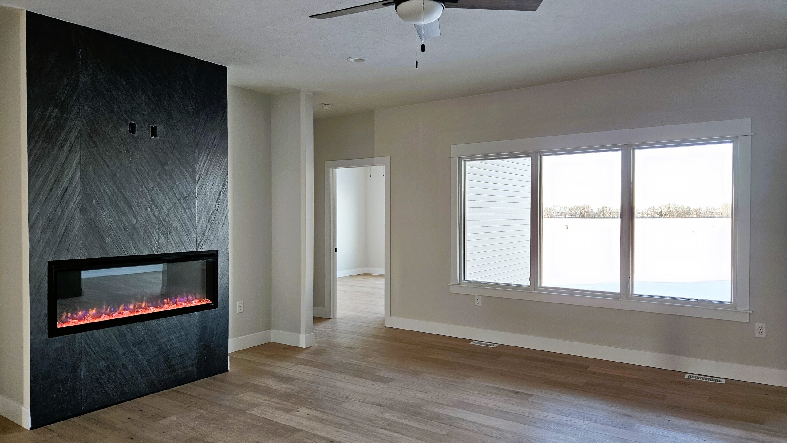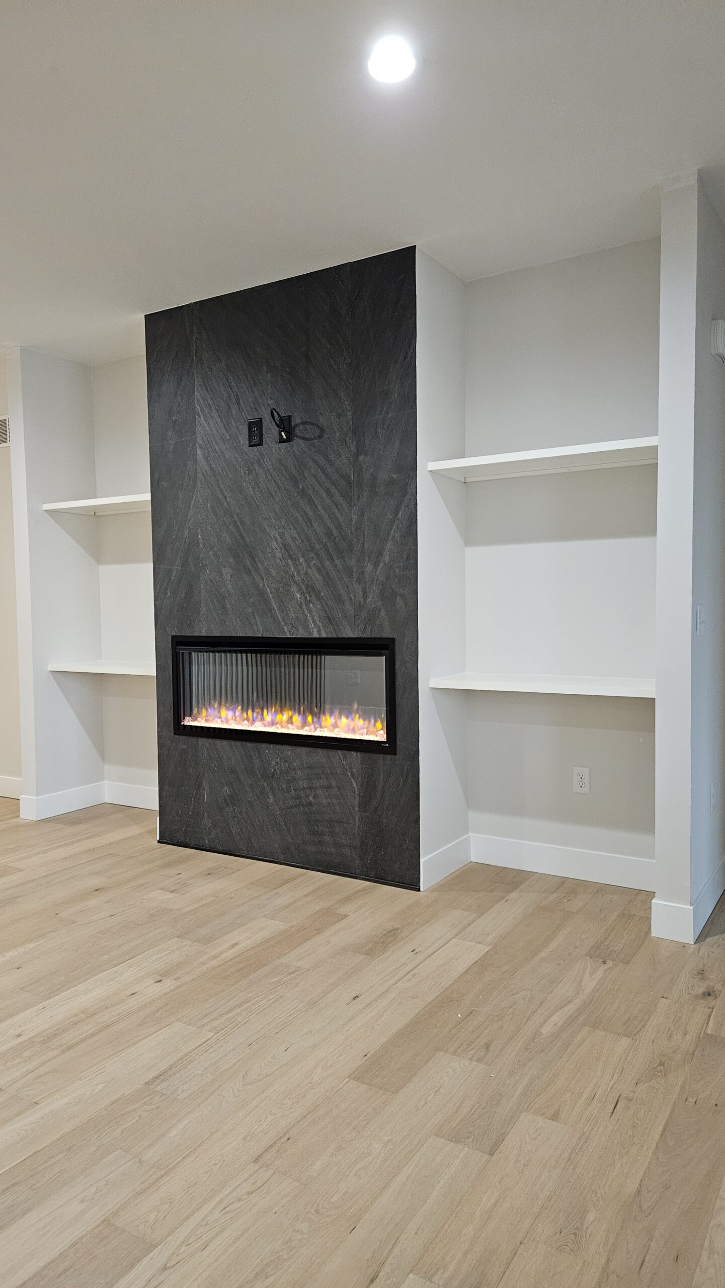 - Modern electric fireplace with adjustable settings and a striking slate wall surround—beautifully scene from both the living room and kitchen for warmth, ambiance, and open-concept living