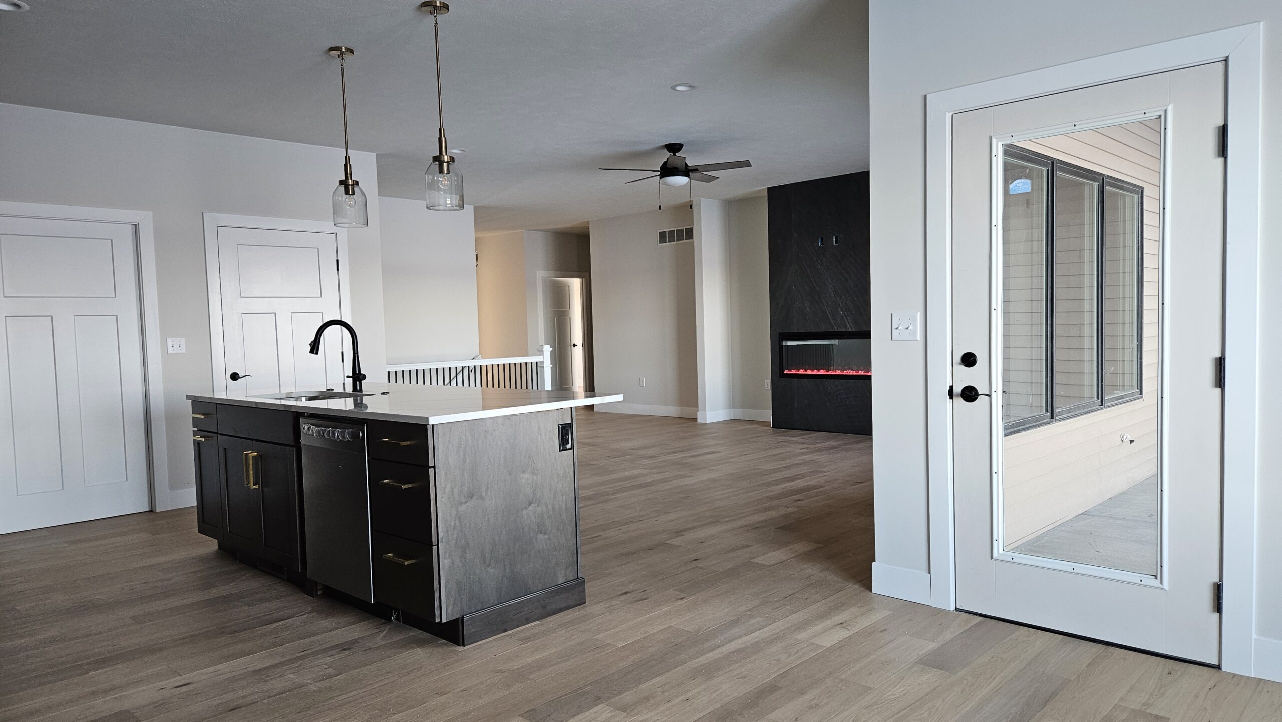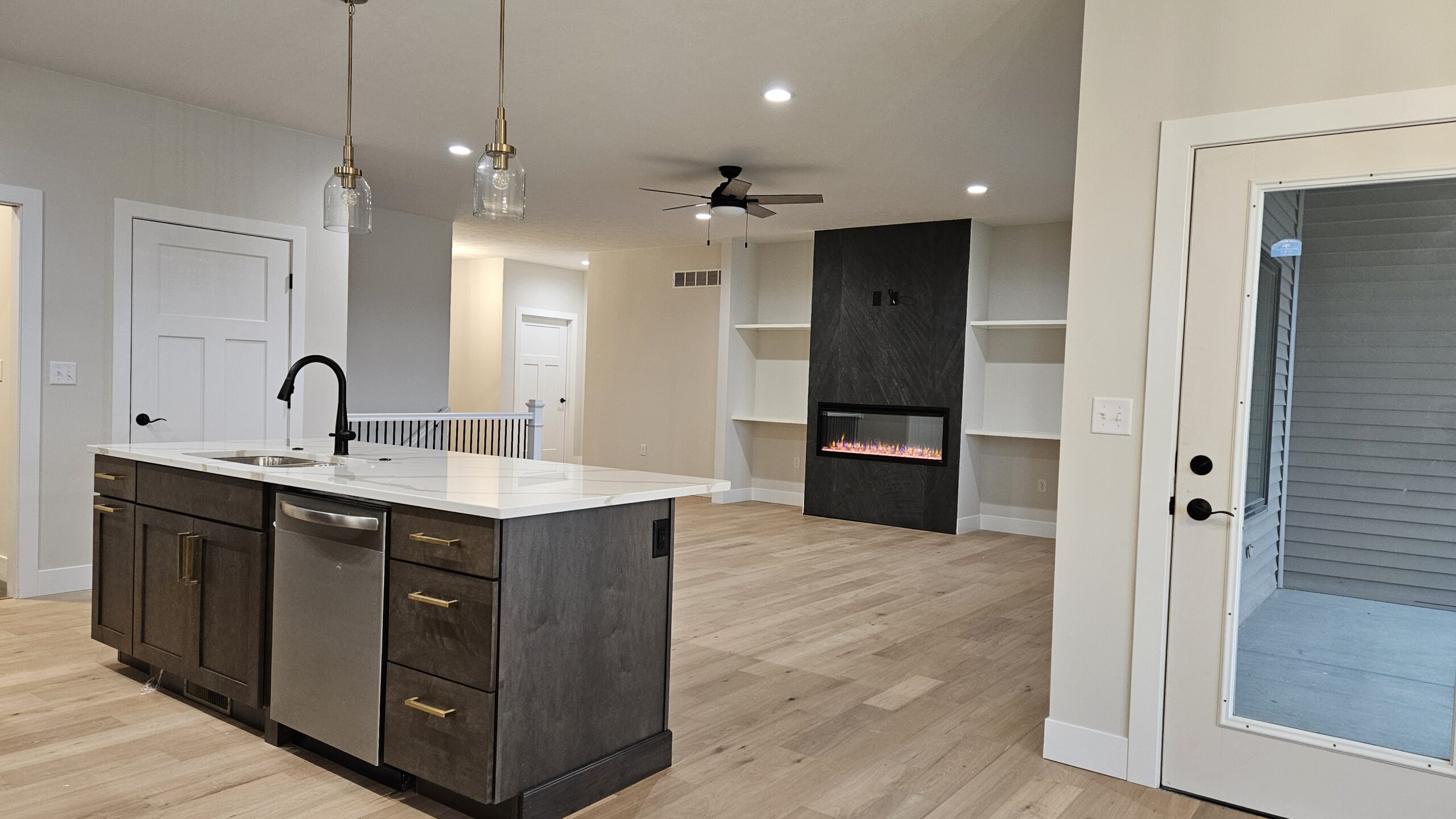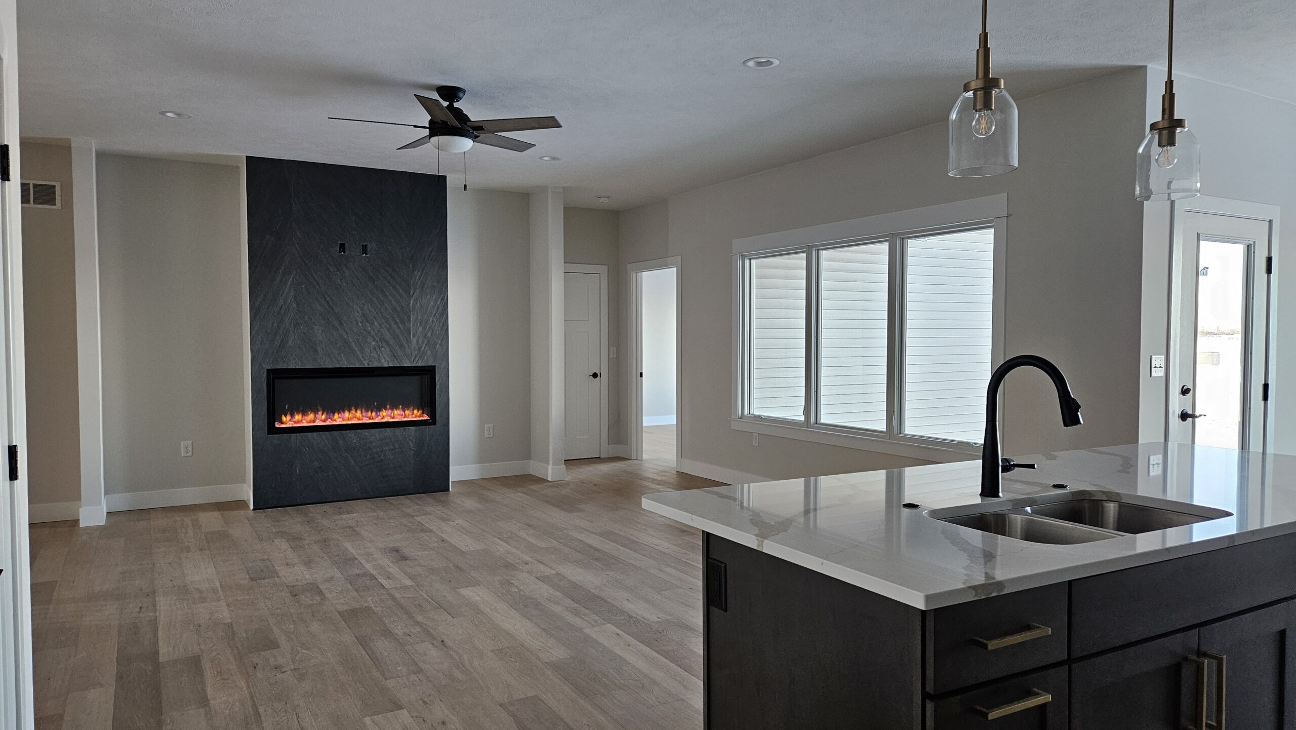- Modern electric fireplace with adjustable settings and a striking slate wall surround—beautifully scene from both the living room and kitchen for warmth, ambiance, and open-concept living
