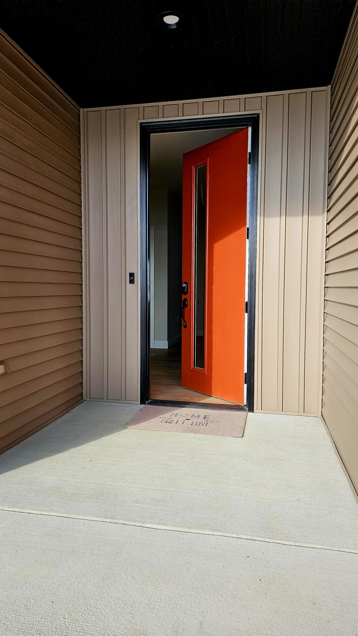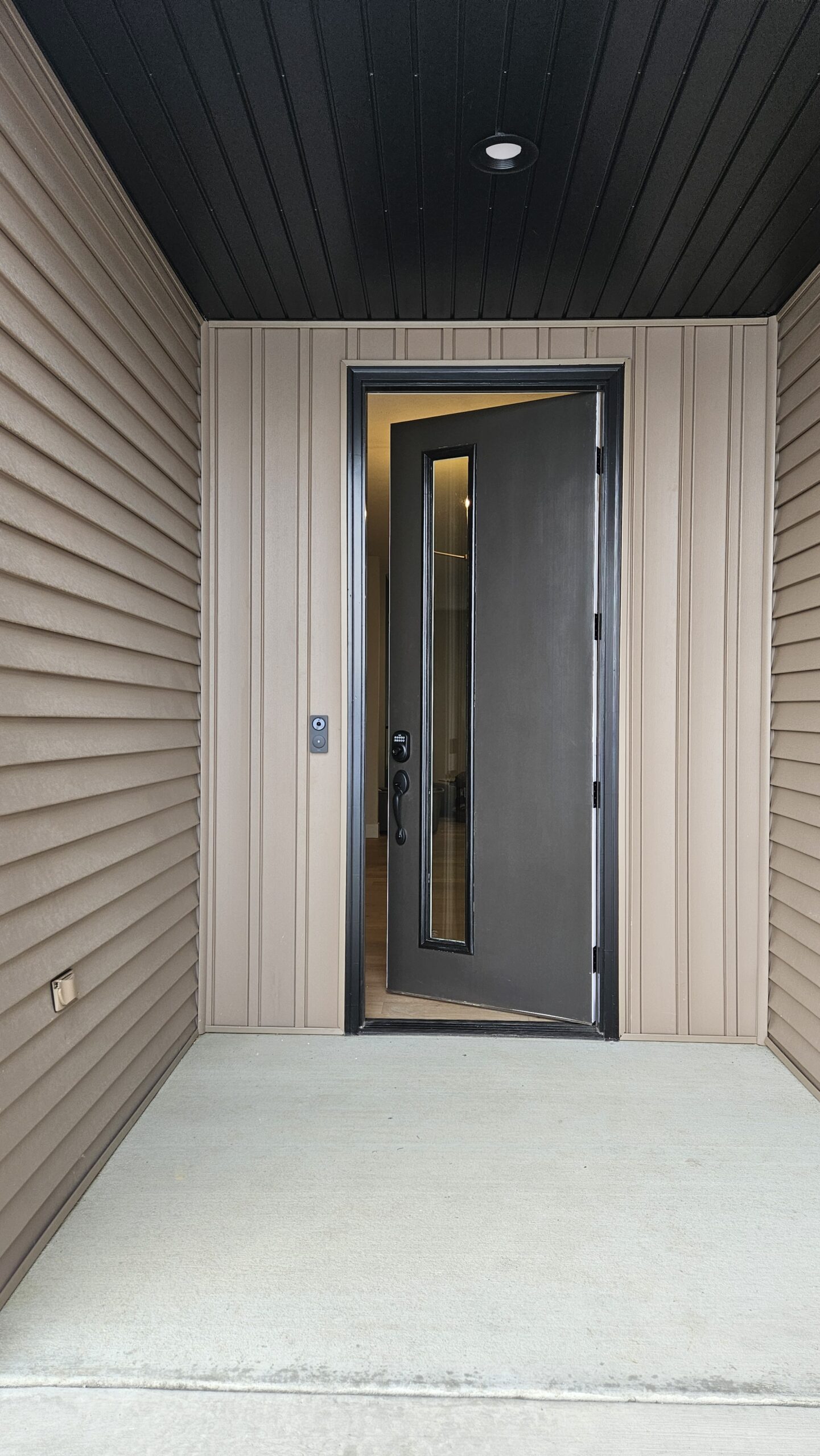 - 8-foot front door with full-length window for clear visibility of guests and packages from any height—combining security, accessibility, and curb appeal