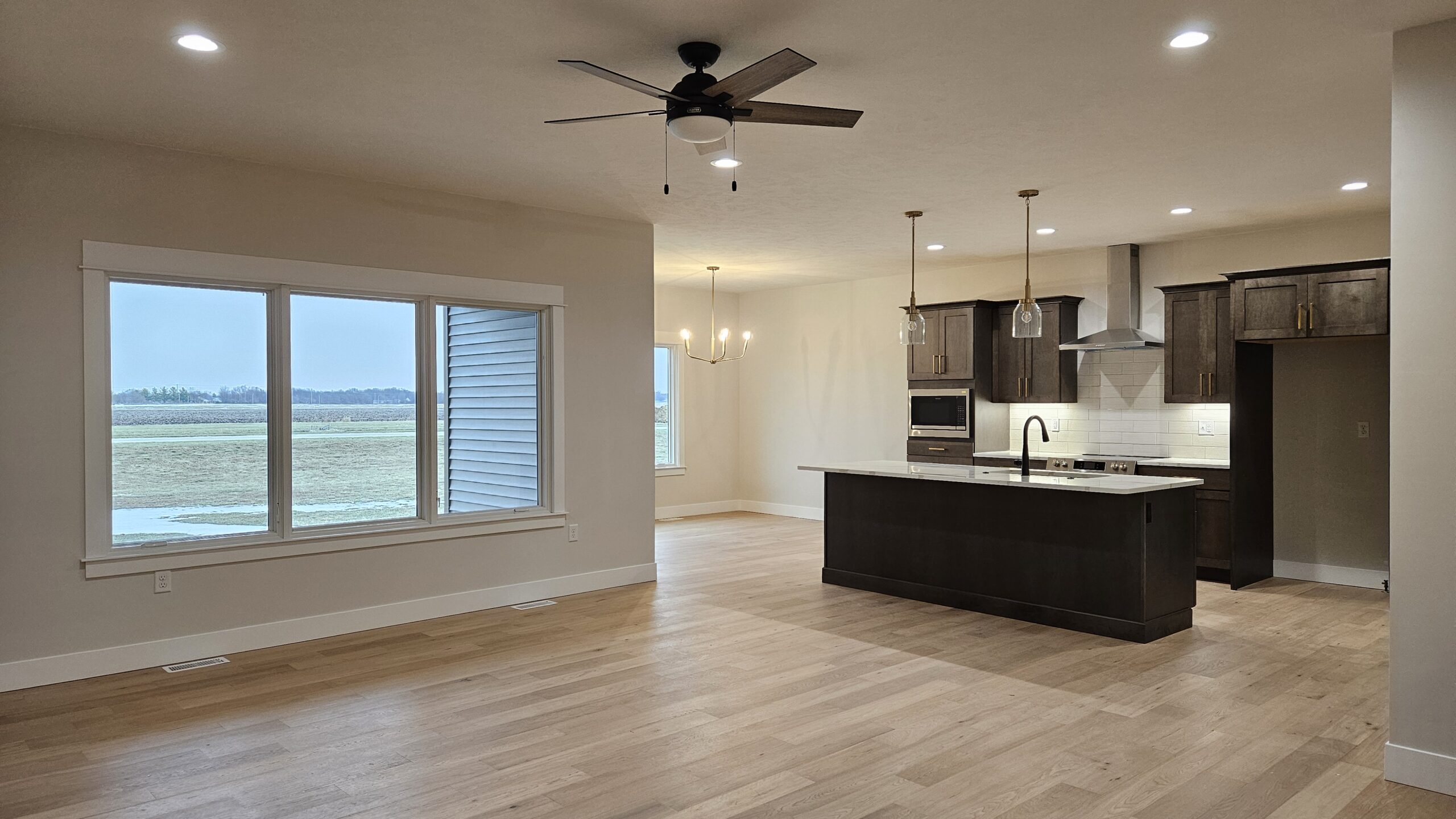 - White oak hardwood flooring flows throughout the main floor, adding timeless elegance, warmth, and durability to every living space